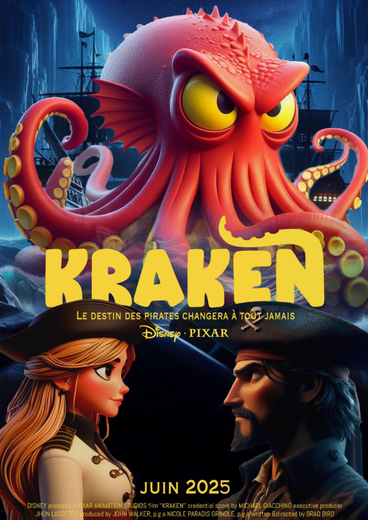 Dans le cadre de mes études, j’ai reçu pour consigne de créer l’affiche d’un film de cinéma entièrement imaginé. J’ai choisi de concevoir l’affiche d’un nouveau dessin animé Disney Pixar, en inventant un univers original autour de l’aventure. L’histoire que j’ai imaginée suit une jeune pirate intrépide et un kraken légendaire. Ce projet m’a permis de travailler la narration visuelle, l’illustration et la construction d’un univers graphique cohérent, tout en explorant les codes propres à l’animation contemporaine.